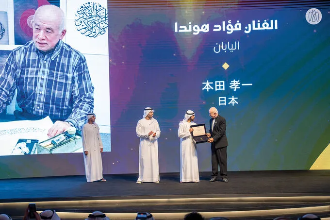 وتوّج معالي الشيخ خليفة بن طحنون بن محمد آل نهيان الفنان والخطاط الياباني فؤاد هوندا، بجائزة "الشخصية الإبداعية"، تكريماً لتاريخه الطويل، والمتميّز في مجال رسم الخطّ العربي، وتدوينه، والتحليق في فضاءات جمالياته، حيث أسهم الفنان، من خلال مشاركته في عدد كبير من المعارض حول العالم، بتعريف الشعوب، والحضارات المختلفة على مكانة هذا النوع من الفنون، ونال التميّز الذي يستحقّه، نظراً لما تحظى به لوحاته من جماليات استثنائية، ولما لشغفه تجاه الحضارة العربية من صدق في التعبير الفني.