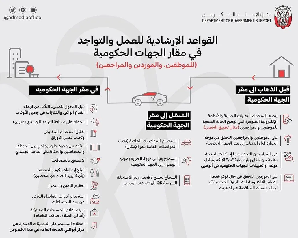 أصدرت دائرة الإسناد الحكومي قواعد إرشادية بخصوص العمل من مقار الجهات الحكومية في أبوظبي، بما يضمن صحة وسلامة الموظفين والمتعاملين.