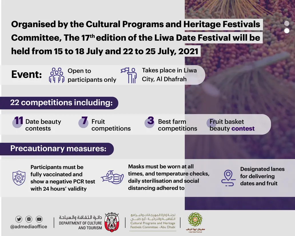 Under the patronage of Mansour bin Zayed, the 17th edition of the Liwa Date Festival, organised by Turathuna, will take place in Liwa City in Al Dhafra from 15 to 18 July and 22 to 25 July 2021 under strict precautionary measures.