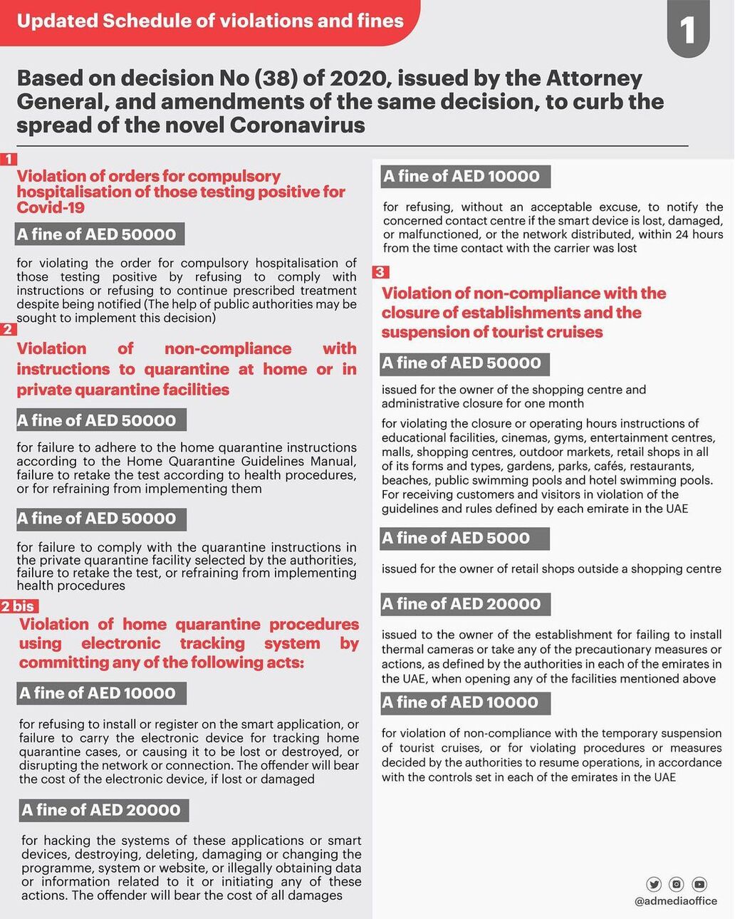 Advisor Salem Al Zaabi, Acting Chief of Prosecution of the Emergency Crisis and Disasters Committee, at the General Prosecution, has announced an update to the list of violations and fines, based on Decision No (38) of 2020, and its amendments, to curb the spread of the novel Coronavirus.