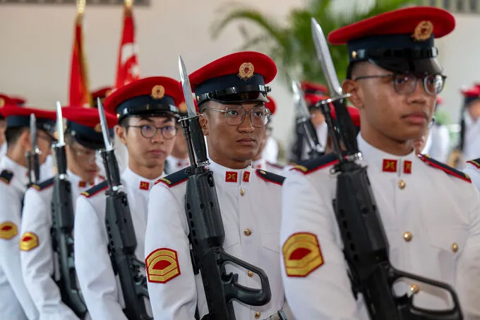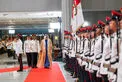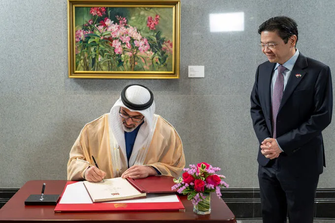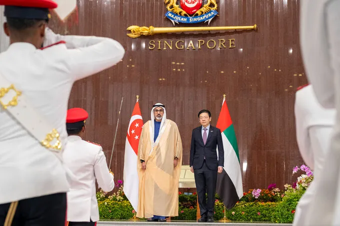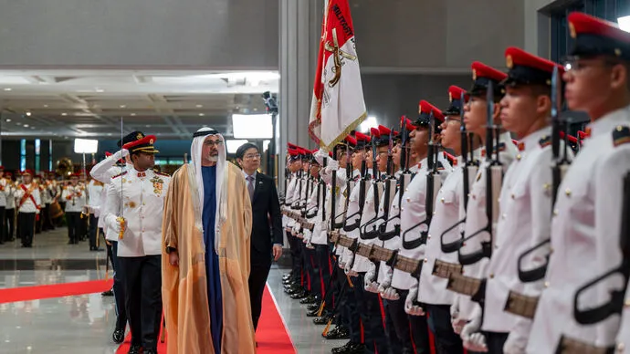 Upon arrival, His Highness was welcomed by His Excellency Lawrence Wong, Prime Minister of Singapore. An official reception ceremony was held, during which His Excellency Lawrence Wong escorted His Highness Sheikh Khaled bin Mohamed bin Zayed Al Nahyan to the ceremonial platform, where the national anthems of the UAE and Singapore were played.