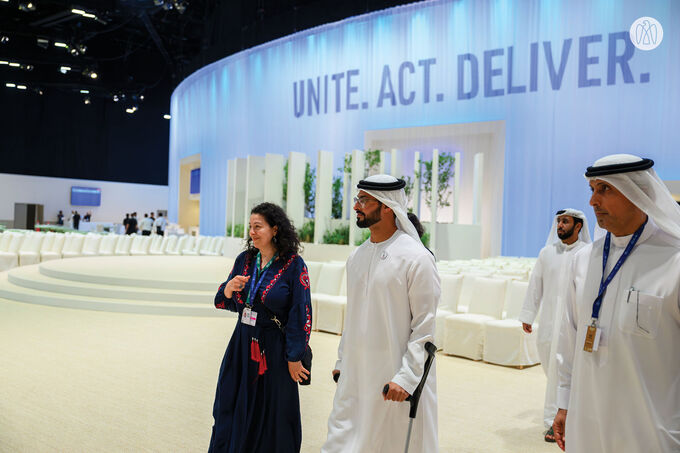 During his visit to Expo City Dubai, His Highness was accompanied by His Excellency Dr Sultan Al Jaber, UAE Minister of Industry & Advanced Technology, Chairman of Masdar and COP28 President-Designate; His Excellency Lieutenant General Talal Belhoul, Director General of Dubai's State Security Department; His Excellency Mohammed Abdullah Al Junaibi, Chairman of Federal Protocol and Strategic Narrative Authority; His Excellency Sheikh Abdulla bin Mohamed Al Hamed; and Angela Migally; along with a number of members of the COP28 Higher Committee.