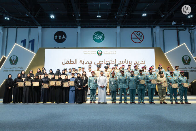 His Highness Lt. Gen Sheikh Saif bin Zayed Al Nahyan, Deputy Prime Minister and Minister of Interior, presided over the graduation ceremony of 54 members from the Ministry of Interior and the General Police HQs. These members successfully completed a specialised program in child protection, qualifying them as specialists in this important field.